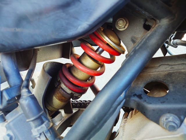 そもそもリアショックアブソーバの役割とは、路面からの衝撃を吸収するスプリング(写真の赤い部分)の振動を抑え、車体安定性(乗り心地、操縦性など)を向上させるためにあります。