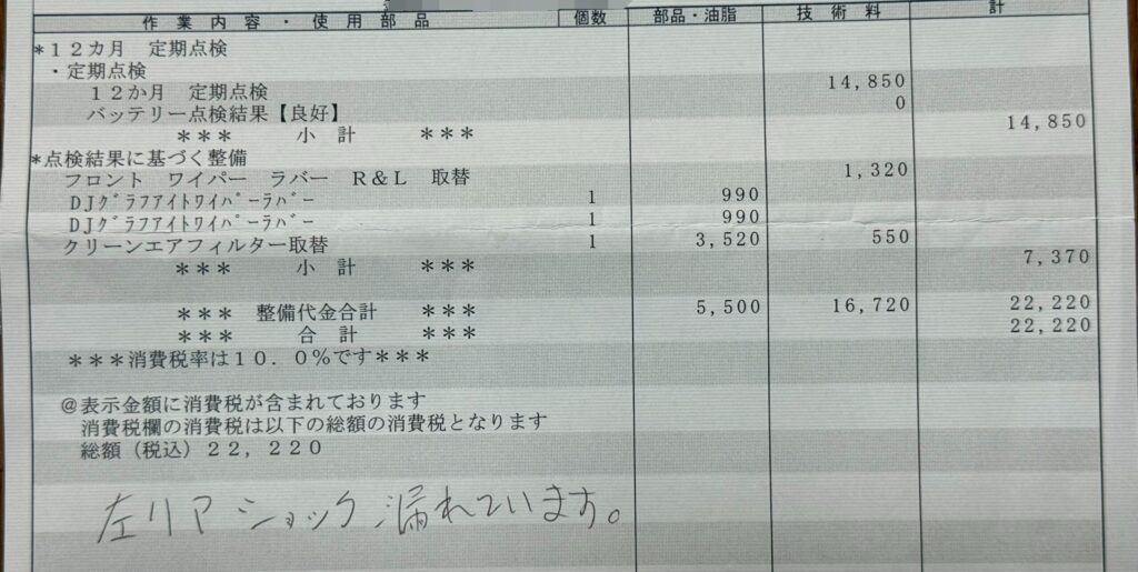 左リアショック漏れています。 には若干びびりましたが、今回は無料で交換してもらいました。