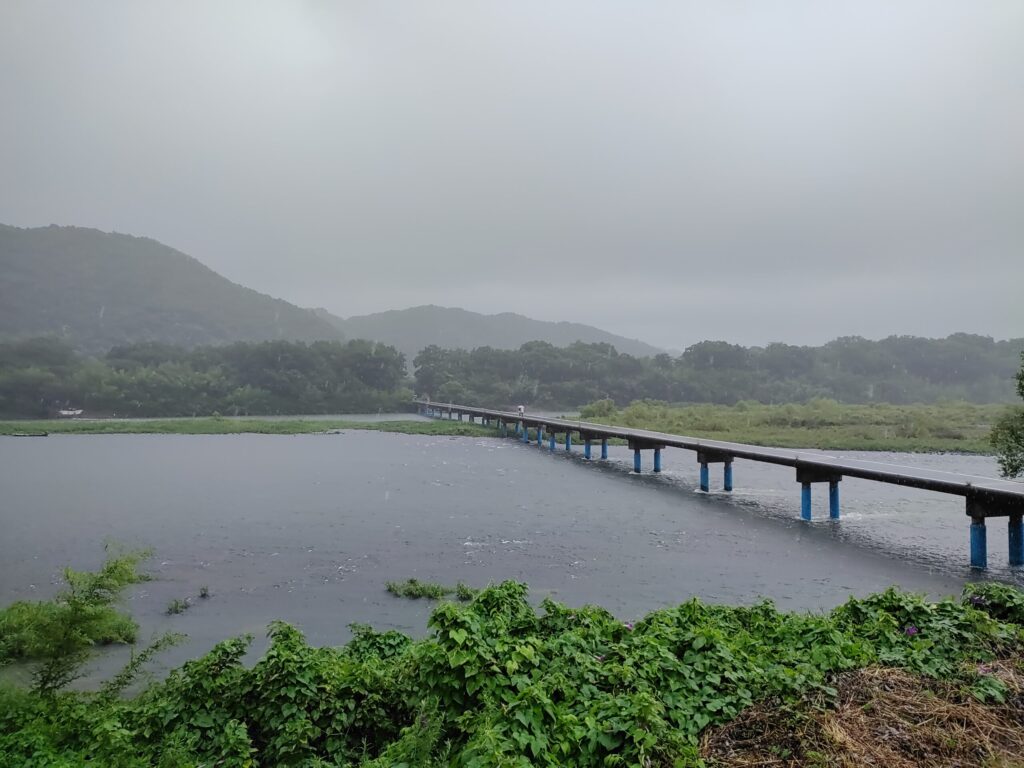 幅は車1台分、よりにもよって雨が降ってる=川が増水している。