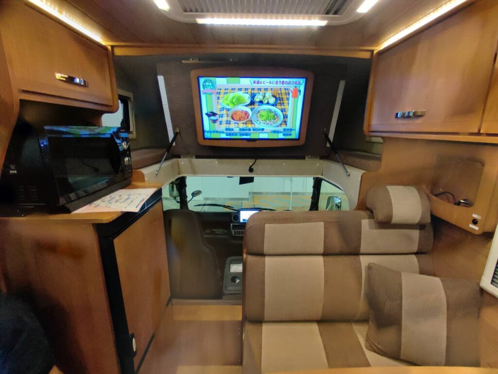 キャンピングカーではテレビ用モニターは小さいというのが一般的でしたが、まさかバンクベッドの裏に付けるビルダーがいるとは・・・。