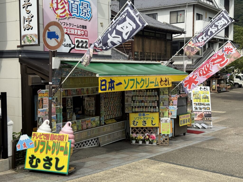 さて、錦帯橋を渡ったら訪れてほしいのがここ、「日本一 ソフトクリーム むさし」(本当に東側へ渡ってすぐのところにあります)。